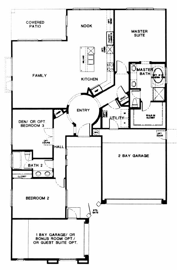 The unique European design features of this home make it a must on your home tour! The house is U-shaped around the gated entry courtyard for maximum privacy. The round entry leads to the 3 different wings of the home: the master bedroom suite, the great room/kitchen area, and the additional bedroom wing (add a flooring inlay to the round entry for an even more dramatic effect!). The spacious kitchen has a center island that faces the family room and dining nook. The spacious master suite has a large walk-in closet and a luxurious master bath with separate tub and shower and raised double sinks. If you need an in-law suite or separate guest quarters with private entry, elect the optional guest suite instead of a 3rd car garage.