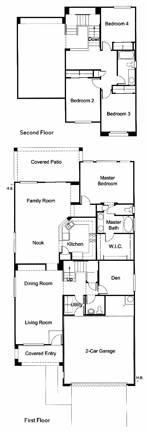 Designed for todays demanding buyers, this house is a four bedroom plus den with the master bedroom and den downstairs, and three bedrooms upstairs. A formal living room/dining room with plant shelves and separate family room with breakfast nook for everyday living. The kitchen has a counter/seating bar that overlooks the family room to make the whole area feel open and comfortable. A large covered patio is easily accessible from the family room. Install a tech center in the upstairs foyer or use it as a separate play or hobby area.