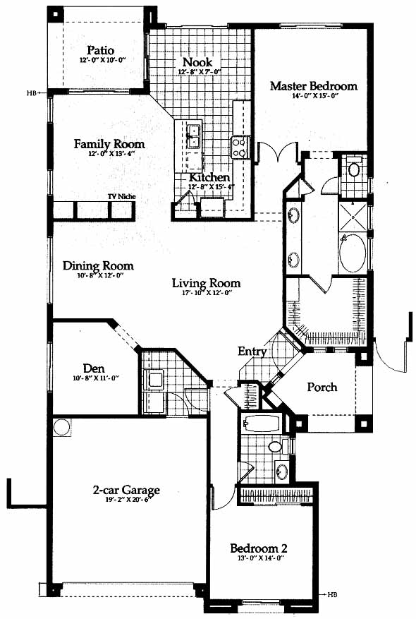 Front porch leads to interesting entry and living room with angled walls. Split bedroom plan. Island kitchen with eating nook and adjoining family room with TV niche.