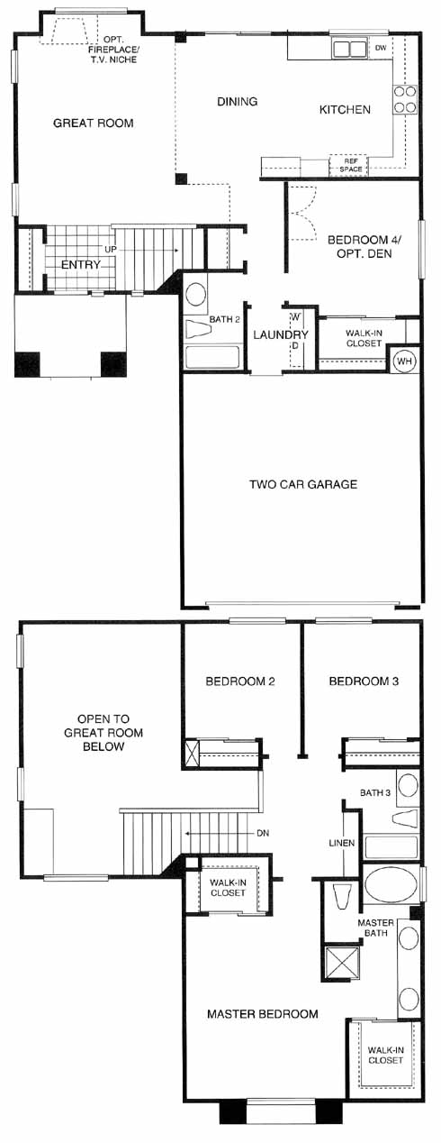 The tiled entry takes you directly into the large great room with optional fireplace/t.v. niche. Open to the great room is the kitchen with dining area which leads to the 4th bedrooms and hall bath. Upstairs you'll find the 2nd and 3rd bedrooms, hall bath and the impressive master bedroom and bath with a walk-in closet.