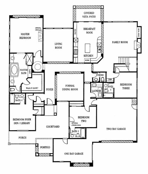 This grand four bedroom two story home has a courtyard entrance. Most of the living space is on the lower level with a vista option or a five bedroom option upstairs. Gorgeous open formal dining and living room areas with master suite nestled in the back of the home for privacy. Large family room area with a lovely gourmet kitchen with granite countertops as standard. Charming breakfast nook area. These homes have optional view lots with lot premiums added to the base price.