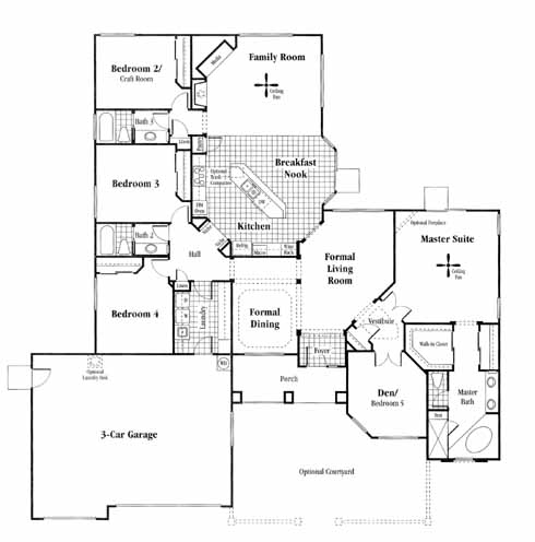 Luxurious single story home with an optional courtyard entry. Large formal dining room and living room. Gourmet kitchen with breakfast nook, open to large family room with media nook. Master suite located away from the main living area to retreat from a long day.