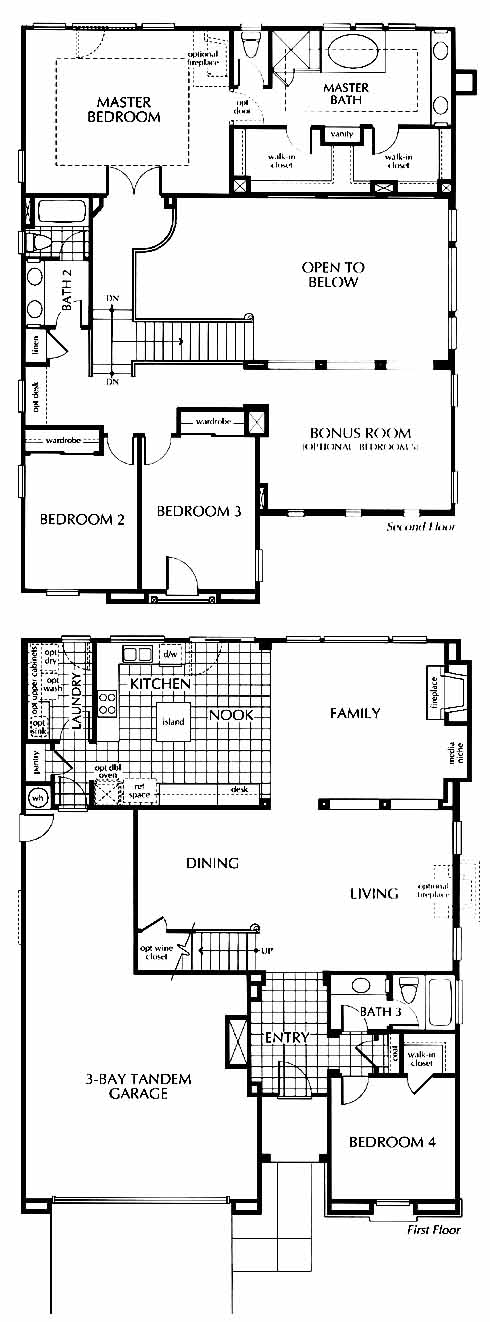 The tiled entry takes you past the 4th bedroom with bath and into the large living and dining room with optional fireplace. From here you can access the family room with fireplace and tiled kitchen with island and nook. Upstairs you have the 2nd and 3rd bedrooms, hall bath, bonus room and the massive master bedroom and bath with his and her walk-in closets.