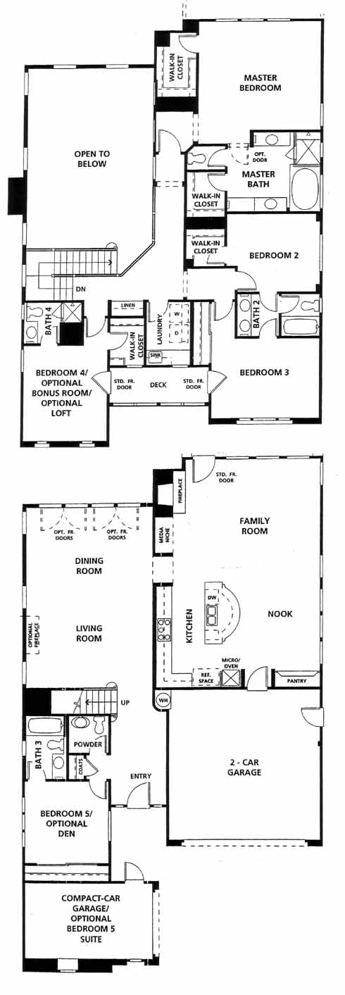 As you enter the home you'll immediately pass the 5th bedroom with bath on your left just before you come to the large living and dining room with optional fireplace. From here you can access the kitchen with island and the family room with fireplace and media niche. Upstairs you'll find the 2nd and 3rd bedrooms with Jack and Jill bath, 4th bedroom with bath and the stunning master bedroom and bath with his and her walk-in closets.
