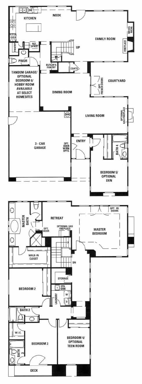 As you enter the home you'll pass the 5th bedroom with bath just before you come to the living and dining room with optional gas fireplace. From here you can access the family room with fireplace and media niche. Open to the family room is the kitchen with island and nook. On the second floor you have the 2nd bedroom, hall bath, 3rd bedroom with bath, 4th bedroom and the massive master bedroom with retreat and the master bath with a walk-in closet.