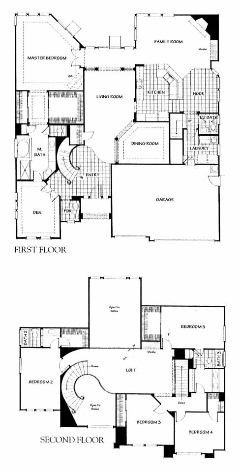 Beautiful two story home with a grand entry, spiral staircase open to large formal living and dining room areas. Grand family room with extended family room option open to gourmet kitchen with breakfast nook and bar. Very private master suite and bath downstairs with a private entrance into the den. Upstairs is open to living areas below. Four bedrooms and a large loft area with media niche.