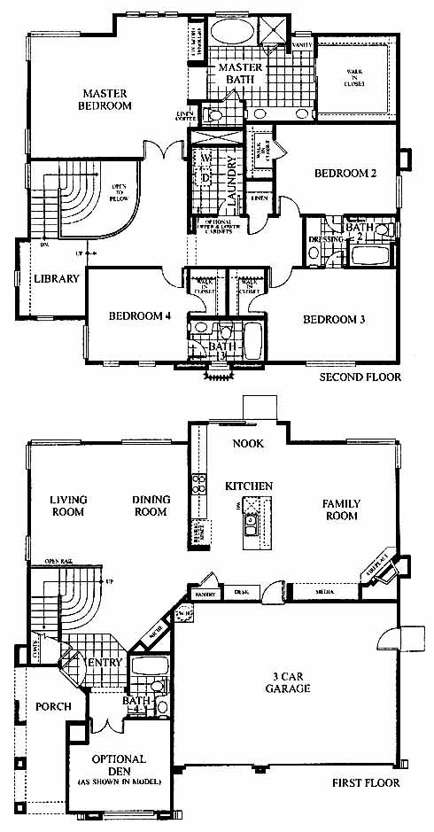 The tiled entry takes you past the optional den with bath and into the large living and dining room. Next you'll come to the family room with fireplace and media niche. Open to the family room is the kitchen with pantry, island and nook. Upstairs you'll find the 2nd and 3rd bedrooms with Jack and Jill bath, 4th bedroom with bath, library and the stunning master bedroom and bath with a walk-in closet.