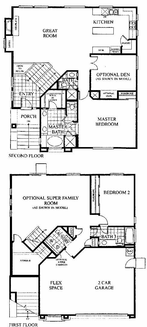 The first floor features the family room and the 2nd and 3rd bedrooms and hall bath. Upstairs you'll find the great room with fireplace and media niche, kitchen with island, 4th bedroom, hall bath and the master bedroom and bath with dual vanities.