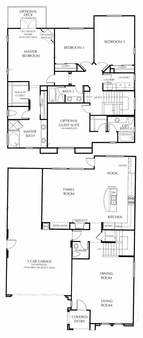 The covered entry takes you directly into the large living and dining room area. Next you'll come to the family room with fireplace and media niche. Open to the family room is the kitchen with island and nook. Upstairs you have the 2nd and 3rd bedrooms, hall bath, optional guest suite with bath and the stunning master bedroom and bath with a walk-in closet.