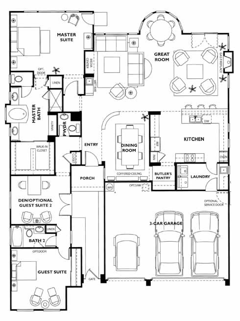 Down the hall to your immediate left as you enter the home you'll find the guest suite with bath and the den. Next you'll pass the dining room just before you come to the massive great room with media center, wet bar and gas fireplace. From here you can access the kitchen with pantry and the master suite and bath with a walk-in closet.