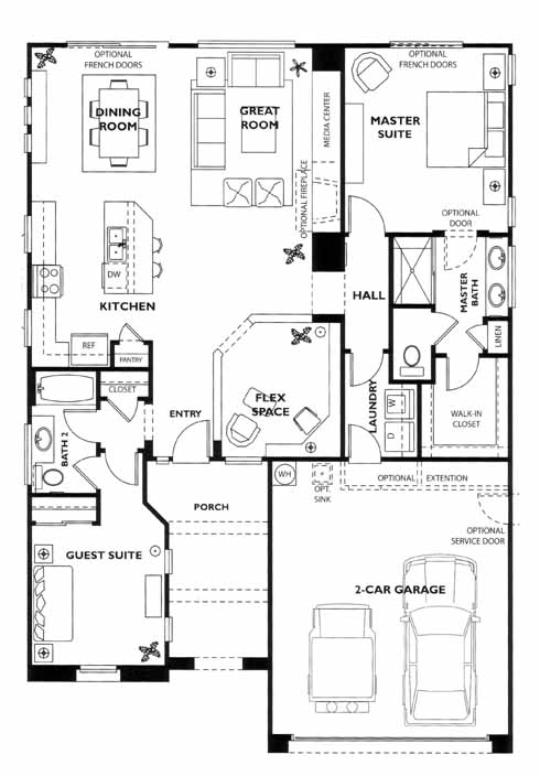 The entry flanked by the guest suite and flex space takes you into the great room with optional fireplace. From here you can access the dining room, kitchen with island and the massive master suite and bath with a walk-in closet.