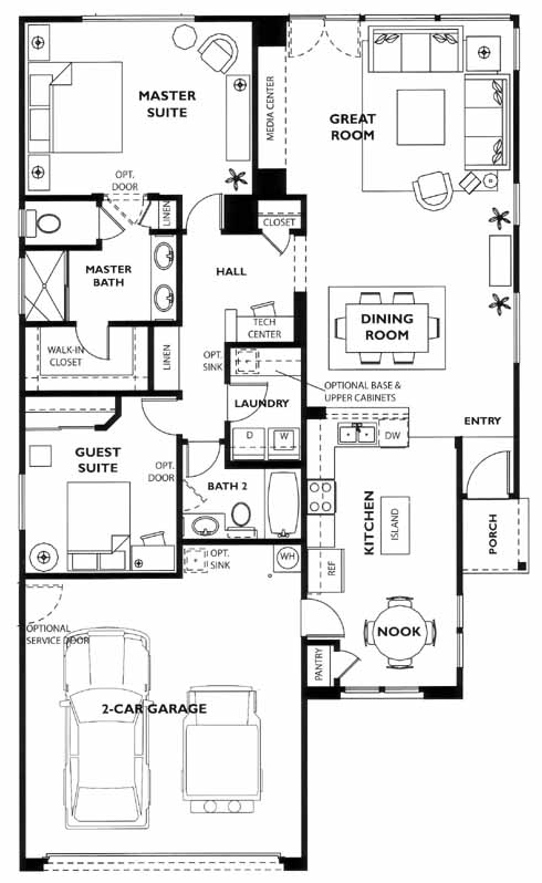 As you enter the home you'll immediately pass the kitchen with island and nook on your way to the lovely dining room. From here you can access the great room, guest suite with bath and the master suite and bath with a walk-in closet.