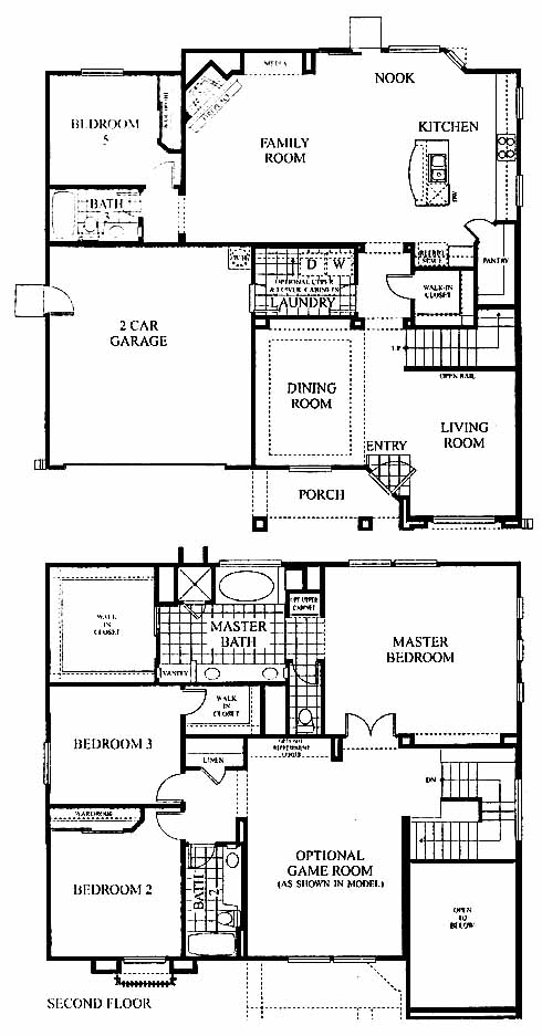 The tiled entry takes you through the large living and dining room and into the family room with fireplace and media niche. From here you can access the kitchen with pantry and nook and the 5th bedroom with bath. Upstairs you'll find 2 spacious bedrooms, hall bath, optional game room and the massive master bedroom and bath with dual vanities, tub and shower.