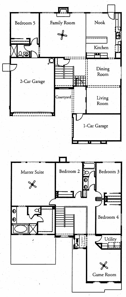This home features a courtyard area at the entrance. The family room is open to a kitchen with nook and the fifth bedroom downstairs has a library option. The second floor has a large game room and the master suite has a spacious walk-in closet, and a luxuriously oversized oval soaking tub.