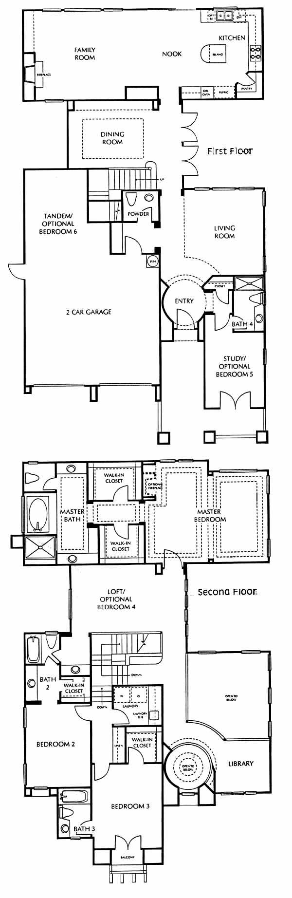 Dramatic circular entry leads to sunny living room with cathedral ceilings and to study or fifth bedroom. Adjacent to the formal dining room is a courtyard patio. Three-car tandem garage can be made into another bedroom. Upstairs you'll find a library overlooking the living room and a sumptuous master suite with options for a fireplace and deck, huge walk-in closets and sinks for both of you.