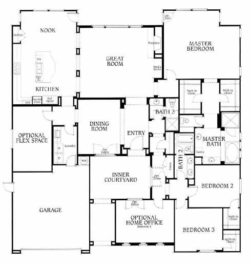 The entry takes you past the dining room and into the great room with fireplace and media niche. To your left you'll find the optional flex space and the kitchen with island, pantry and nook. On the other side of the home you have the optional home office, 2nd and 3rd bedrooms, hall bath and the master bedroom and bath with his and her walk-in closets.