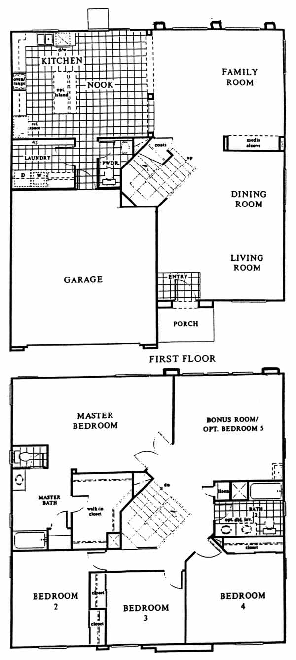 This two story home features options such as a fireplace with media alcove in the family room, fireplace in the master bedroom. There is a large kitchen with an optional center island.