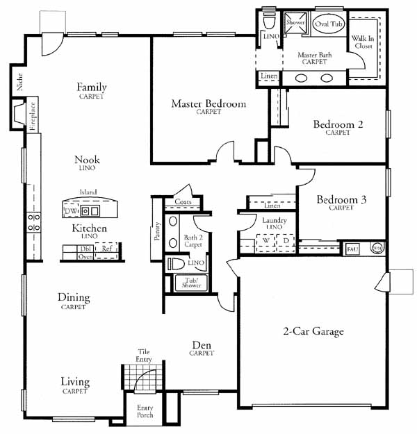 A beautiful single story floor plan with dramatic 9 ft. ceilings, luxurious master bedroom suite and spacious open kitchen area.