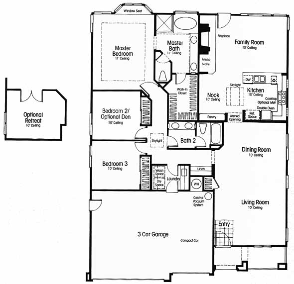This spacious single story home offers an optional third bedroom, a family room with fireplace, nook and laundry room. A skylight in the kitchen makes for a bright and sunny cooking area. An optional retreat or den is possible instead of bedroom number 2. Master bath and bedroom have 11' ceilings.
