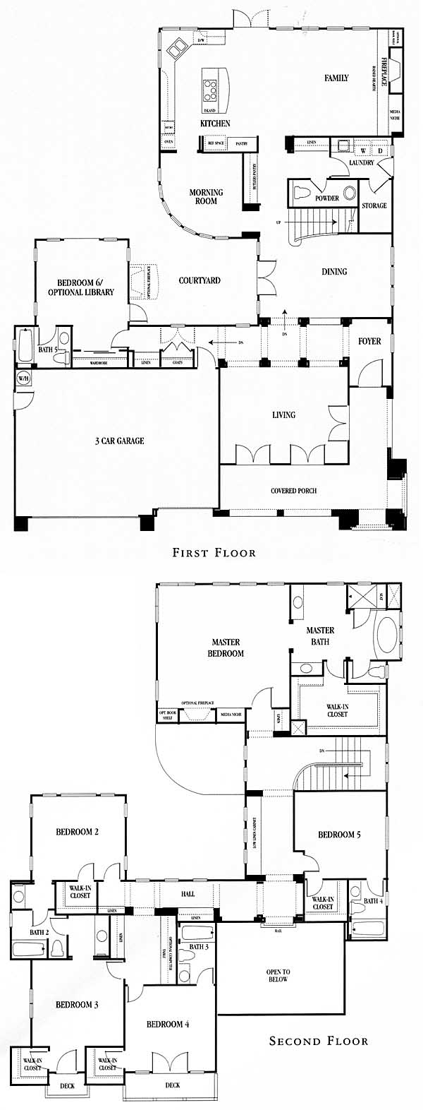 This two story home has the serenity of a private courtyard. A sun-drenched morning room makes for a bright and light-filled area. The sixth bedroom can be converted into a library, plus there can be an optional deck outside the master bedroom. Bedrooms three and four have built in desks. The kitchen has a central island and overlooks the family room with fireplace. Covered porch surrounds two sides of the living room with French doors for access.