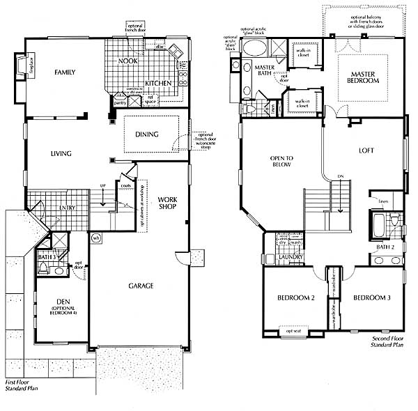 The den can become an optional fourth bedroom. The kitchen offers a nook and optional French doors to the backyard. The garage features a large workshop area. There is an optional balcony off of the master bedroom, with the choice of a sliding door or French doors. Dramatic volume ceilings and elegant architectural details. Loft above looks over the living and family rooms.