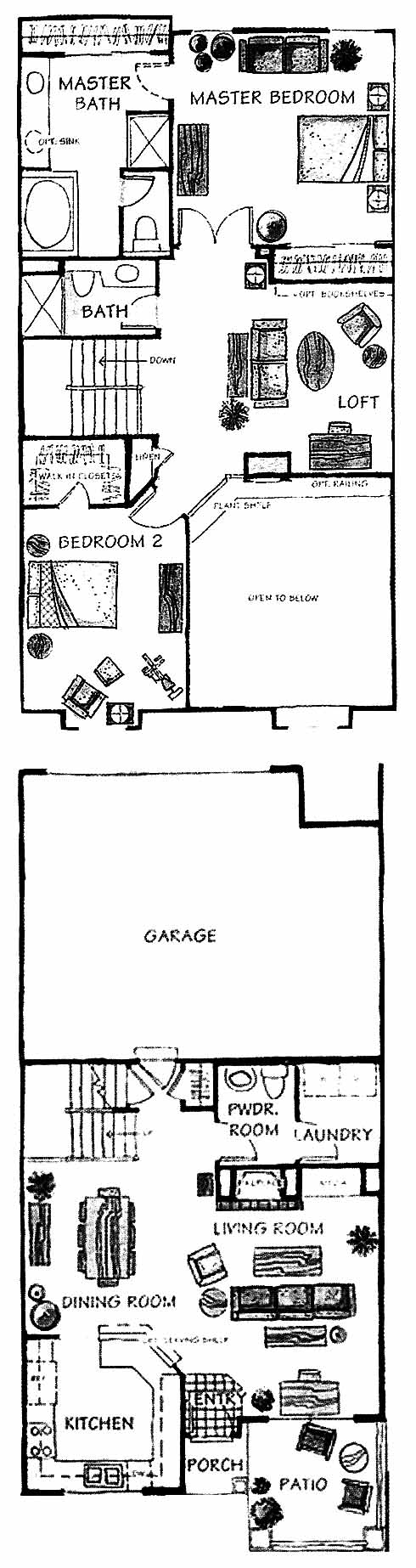 As you enter the home you'll step directly into the living and dining room with fireplace. From the dining room you can access the powder room and kitchen with wrap around counter. Upstairs you have the 2nd bedroom, hall bath, loft area and master bedroom and bath with optional dual vanities.