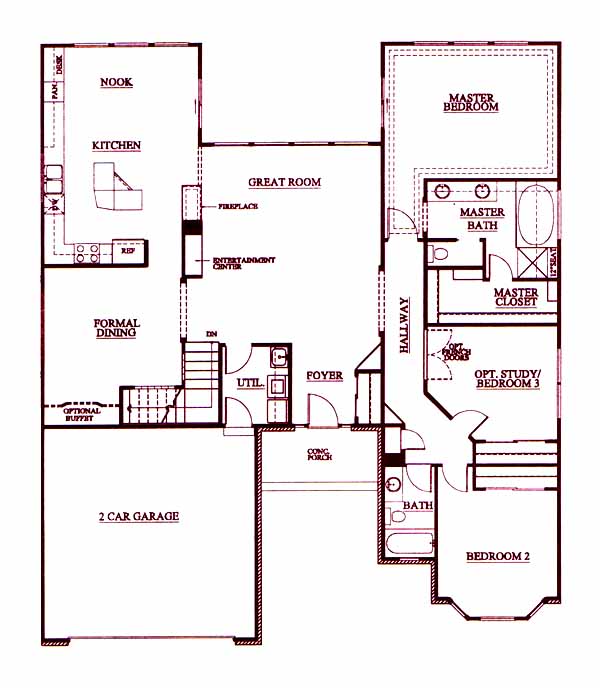 Ranch style home for convenient one-level living! Very open with large great room w/gas fireplace and built-in entertainment center. Formal dining room w/optional bay window and built-in buffet. Large island kitchen w/nook. Huge Master suite w/luxury bath. Two additional bedrooms or make one a study and add french doors. Need more room? Finish the basement (optional) and gain two more bedrooms, bath and huge rec room w/wet bar.