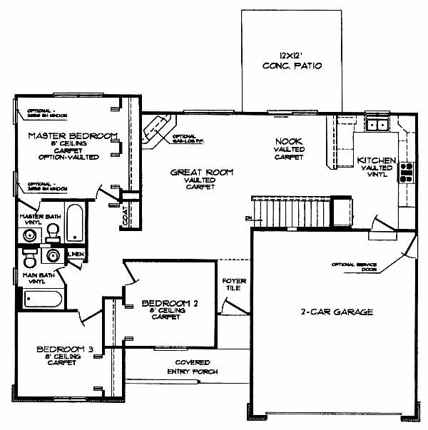 A ranch style with an open great room concept. The kitchen is open to the nook and great room and all are vaulted ceilings. The is a 12' by 12' rear patio off of the nook. The plan has three bedrooms and the master suite offers a private full bath and another full bath down the hall. The two car garage is standard as well as a 1045 square foot unfinished basement.