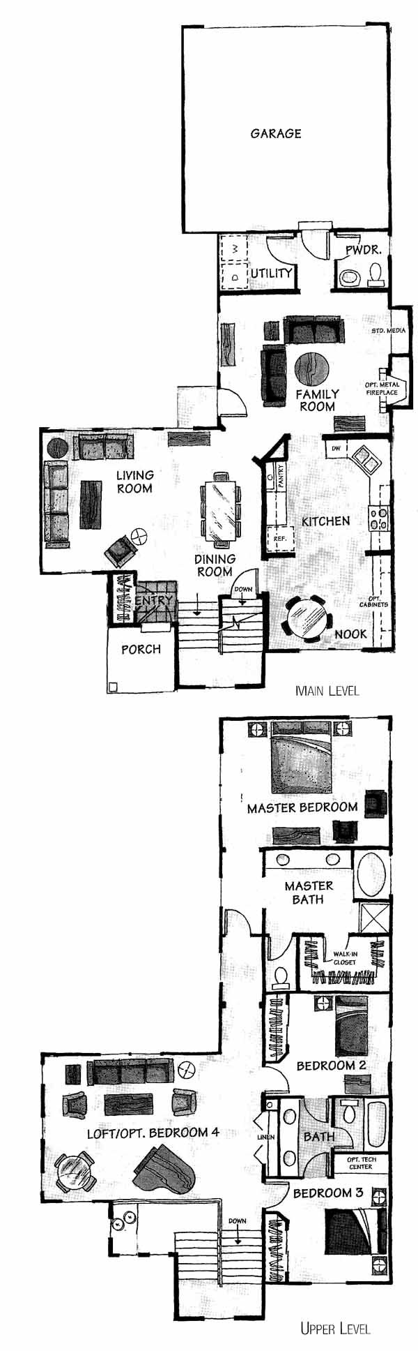 A two story with a living/dining area combination as you enter; the kitchen with breakfast nook is off to the side. Behind the kitchen is a large family room then the utility room and half bath as you enter the 2-car garage. The upper level has two bedrooms that share a common full bath and there is a huge loft (optional 4th bedroom) the master suite has a 5-piece bath and large walk-in.