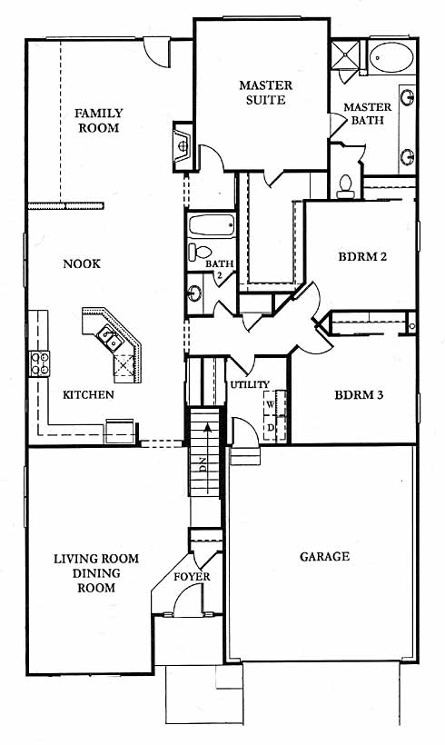 A large ranch style floor plan with a formal living/dining area as you enter from the foyer. The kitchen features a nice island and eating nook looking into a family room. A luxury master bedroom suite with five piece bath and large walk-in closer are right off the family room separated from the other two bedrooms and full bath. A two car garage is standard.