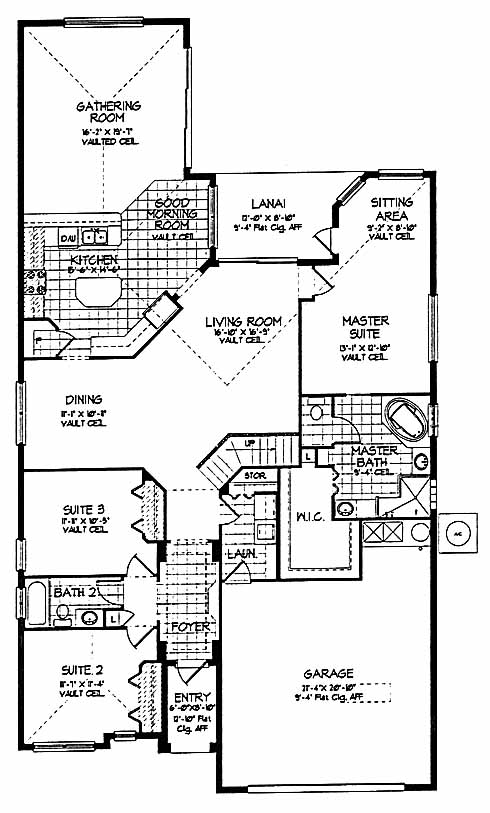 This home has two bedrooms and a bath at one side of the foyer. The master suite in the back includes a private bath with tub and separate shower, an oversized walk-in closet and a sitting area. Dining and living rooms in the middle of the home add to the open feel of the design. The gathering room in the back is perfect for entertaining. The kitchen has an island workspace, a walk-in pantry and opens into the good morning room.