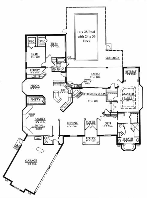 This home has a dining room and den on either side of the foyer entrance. The gathering room includes access to the lanai and an optional fireplace available. The family room has a window seat and built-in entertainment center. The kitchen has an island workspace for preparing meals and a walk-in pantry. The nook nearby has a bay window. Two bedrooms in the back include walk-in closets and access to a bath with double vanity. The master suite on the opposite side of the home includes a retreat area, private access to the lanai with pool and deck, his and her walk-in closets and a luxurious master bath. Price does not include a homesite.