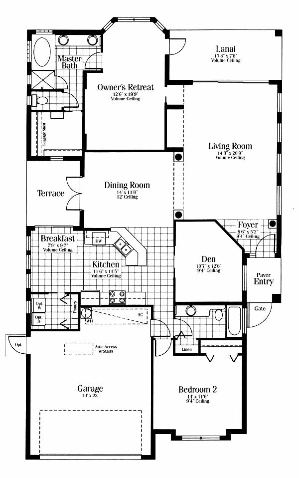 You'll enjoy gated, country club living at it's finest, with a community pool and golf course when you make this model your home! Features Owner's Retreat with volume ceiling and master bath, walk-in closet, and direct access to the lanai. Dining room overlooks the terrace as does the breakfast room and kitchen which both have volume ceilings as does the living room. Includes a den, paver entryway and serpentine paver walkway and two car garage.