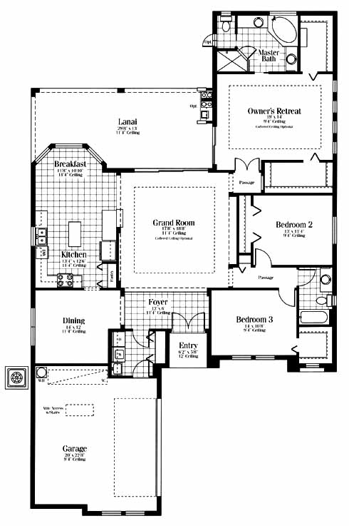This home features a large grand room centrally located with large sliding doors that access the lanai outside. To one side are the three bedrooms, including the owner's retreat with his and her walk-in closets and private bath. On the opposite side of the grand room is the kitchen with pantry, breakfast room with bay window and the dining room. The laundry room provides secondary access to the home from the side-entry garage.