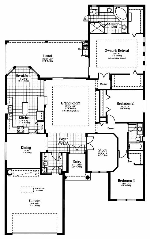 This home has a study and dining room at either side of the foyer entrance. The laundry room is also closeby and provides secondary entry to the home from the garage. The grand room includes access to the lanai outside and is a great space for entertaining guests. The kitchen with island workspace and breakfast area with bay window are to one side of the great room. To the other side are two bedrooms that share a bath and the owner's retreat with his and her walk-in closets and a private bath with tub and separate shower.