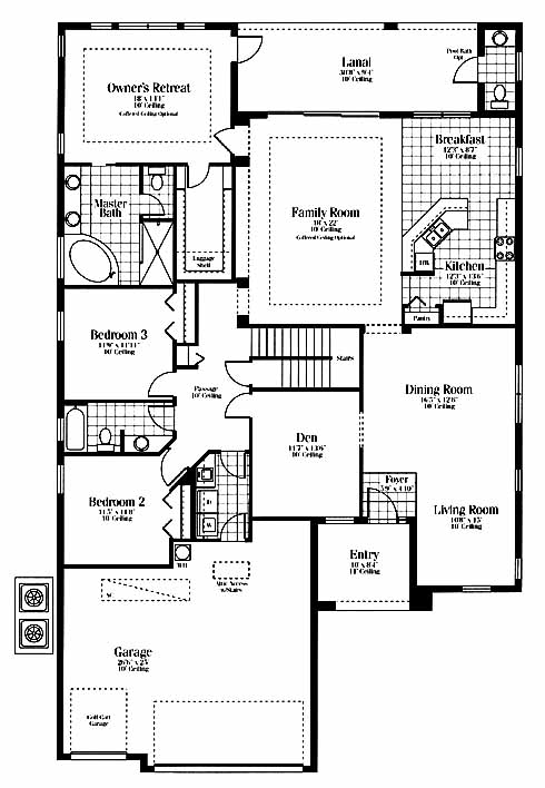 This two-story home has large living and dining rooms at the foyer entrance and a den to the left that makes a nice office. The family room will be a popular gathering spot for everyone in the family with its spacious design and close access to the kitchen with pantry. The breakfast area has views of the lanai outside. The owner's retreat includes private access to the lanai, a large walk-in closet and a private bath with garden tub and separate shower. Two more bedrooms share a bath between them. The laundry room allows secondary entry into the home from the three car garage. The second-floor bonus room makes a nice game room or fitness area.