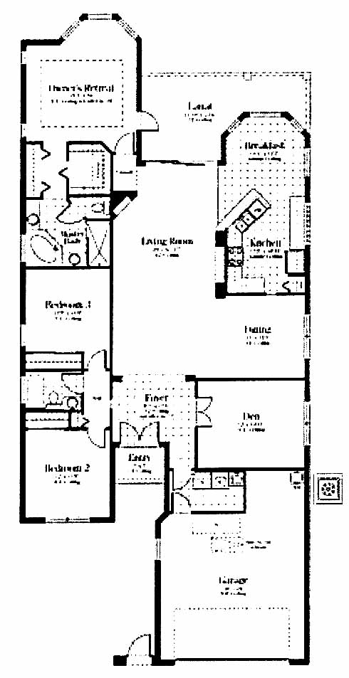 Beautiful owner's retreat in the back includes a sitting area, private lanai access, his and her closets and a master bath with dual vanities. Two bedrooms at the front share a bath between them. The den to one side of the foyer entrance makes a nice home office. The dining room leads to the kitchen with pantry and breakfast area. The living room includes access to the lanai outside.