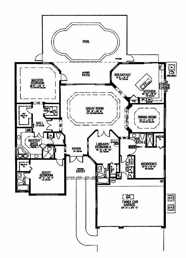 Upon entering you will enjoy a Great Room overlooking a covered patio and Tropical yard area. This well designed one story home with family room has over 3200 sf and features 3 bedrooms plus library, 4 baths, 3 car garage. The triple split bedroom plan is perfect for all size families.