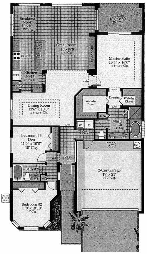 One story residence with large great room. Kitchen with pantry and an adjoining breakfast nook. Separate dining room. Large master suite with dual walk-in closets and a lanai. Bedrooms two and three share the other bedroom.