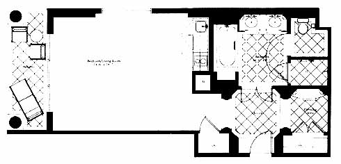 This studio home includes a small kitchen area that overlooks the bedroom/living room area that includes access to the balcony. The foyer has a dressing area to one side and a bathroom straight ahead that includes a double vanity, tub and separate shower.