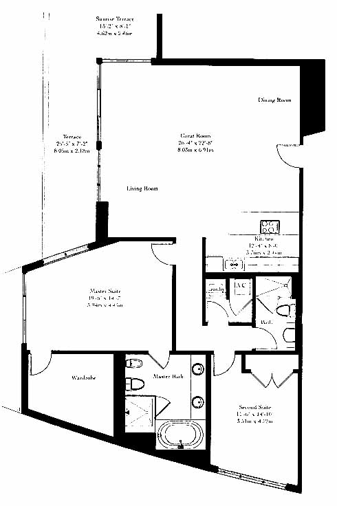 This condominium home opens into the dining and living rooms that includes access to the terrace on two sides. The kitchen overlooks the dining room and includes ample counterspace for preparing meals. The master suite includes a private sunset terrace, an oversized walk-in wardrobe closet and a master bath with double vanity, tub and separate shower. The second suite has gorgeous views.
