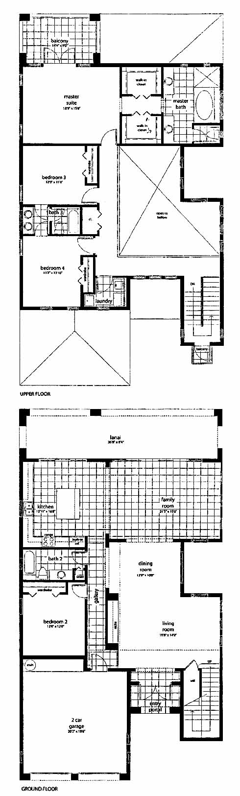 This two-story home opens into the living and dining rooms. The family room is a nice spot for relaxing on the weekend and includes access to the lanai. The kitchen has an island workspace for preparing meals while overlooking the family room. A first-floor bedroom could be used as a home office if needed. The master suite includes a private balcony, his and her walk-in closets and a master bath with garden tub and separate shower. Two more bedrooms share a bath between them. Views of the dining and living rooms below can be seen from the hall.