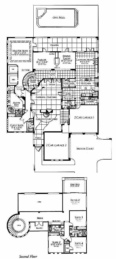 This home has garden and gathering courtyards that lead to the entry with gallery. Enjoy a drink in the parlor with ale bar before having your dinner party in the dining room. Relax on the weekend in the gathering room with optional fireplace available. The kitchen with walk-in pantry also has an island workspace before leading to the cafe. The first-floor master suite includes private access to the veranda, a sitting area, his and her walk-in closets and a master bath with garden tub and shower. The second floor has three suites, including one with a private bath. The retreat area opens out to the view deck.