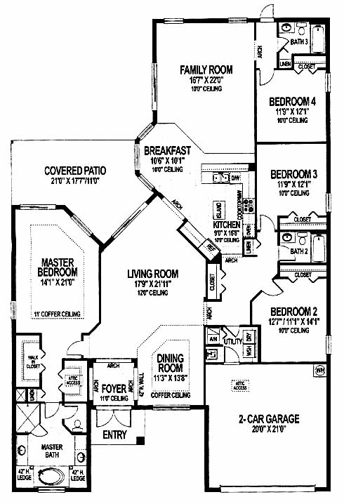 This split-plan home includes living and dining rooms at the foyer entrance that provide views of the covered patio in the back. The master bedroom nearby includes his and her walk-in closets, private access to the patio and a master bath with tub and separate shower. The kitchen includes an island workspace before opening into the breakfast area. Relax in the family room on the weekend after a long work week. Three more bedrooms and two baths provide plenty of space and privacy for growing kids and visitors.