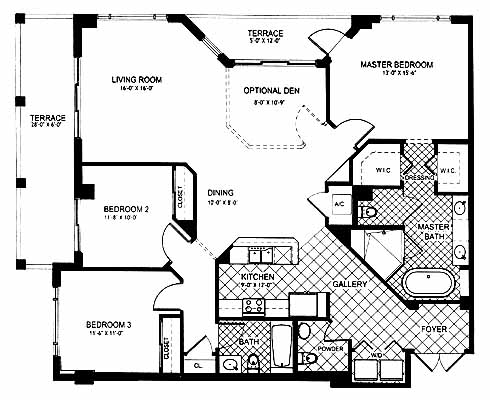 This condominium home has a kitchen to one side of the gallery that includes ample counterspace for preparing meals and overlooks the dining room. Entertain guests in the living room with access to the terrace. An optional den makes a nice home office. The master bedroom includes his and her walk-in closets, private access to the terrace and a master bath with double vanity, tub and separate shower. Two more bedrooms share a bath.