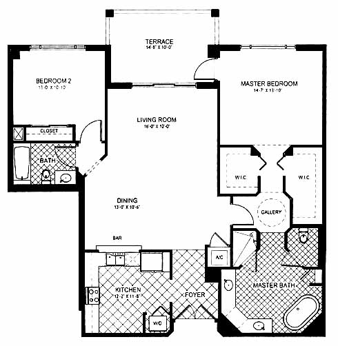 This condominium home has a kitchen to one side of the foyer that has ample space for preparing meals and a bar area. The dining and living room space is a nice area to entertain guests and includes access to the terrace through sliding doors. The master bedroom includes his and her walk-in closets, private access to the terrace and a master bath with double vanity. A second bedroom is located on the opposite side of the condo.