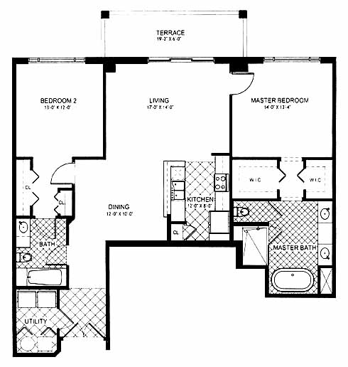 This condominium home opens into the dining room with kitchen to one side that includes a pantry and countertop eat-in. Relax on the weekend in the living room that also has access to the terrace. The master bedroom includes his and her walk-in closets and a master bath with double vanity, tub and separate shower. The second bedroom has ample closetspace and access to the bath.