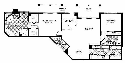 This condominium home has a dining room to one side of the foyer entrance. The living room includes access to the terrace. The optional den makes for a nice home office. The master bedroom with private access to the terrace also includes his and her walk-in closets, a dressing area and a master bath with double vanity. A second bedroom is located at the opposite side of the condo.