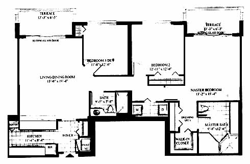 This condominium home has two terraces including a private one in the master bedroom that also has a walk-in closet, dressing area and master bath with double vanity. Two more bedrooms share a bath, with an option for either being used as a den or home office as needed. Entertain guests comfortably in the living/dining room where the second terrace can be found. Prepare meals with ease in the spacious kitchen with pantry to one side of the foyer entrance.