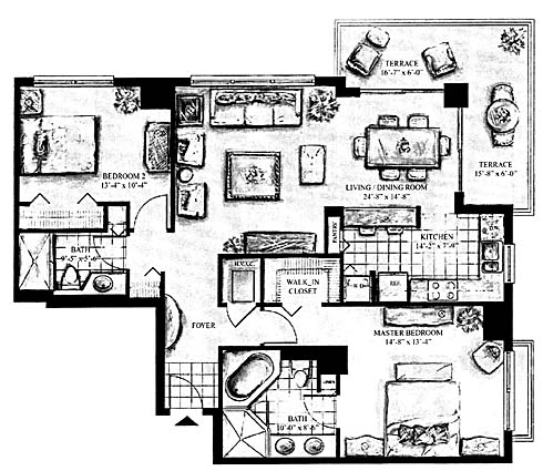 This condominium home has a spacious kitchen with pantry that overlooks the dining room. Relax on the weekend in the living room with views of the city. The master bedroom includes a walk-in closet, a private terrace and a master bath with double vanity, tub and separate shower. The second bedroom also has a walk-in closet and private terrace accessible through sliding doors.